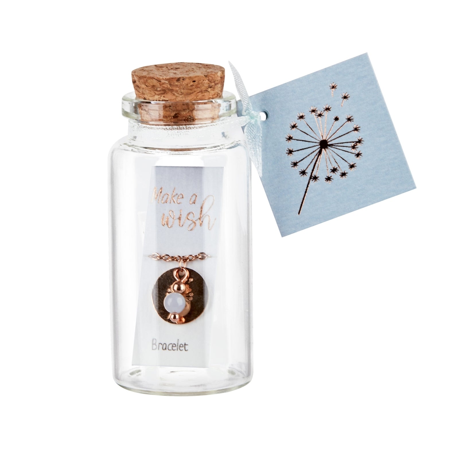 Schattig, klein glas met daarin armbandje met een betoverende hanger van echte steen en een klein plaatje. Het armbandje heeft een verlengkettinkje van ca. 3 cm en is dus variabel in lengte.
