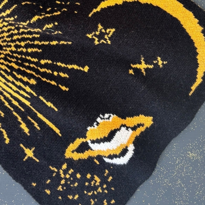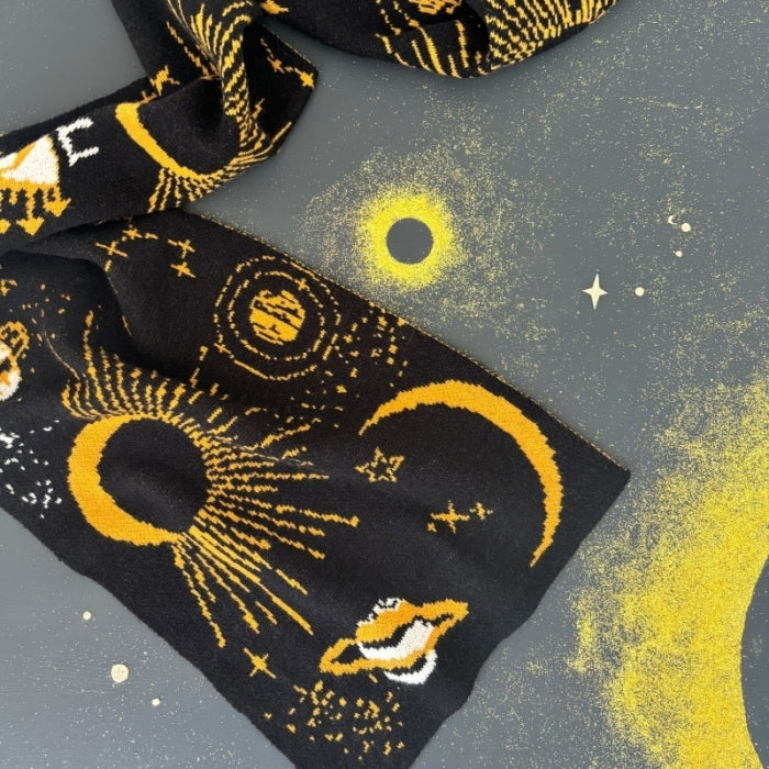 Trakteer jezelf op een vleugje kosmische elegantie met deze prachtige sjaal. Versierd met een prachtig patroon van sterren en planeten is deze sjaal magisch op kille winterdagen wanneer de wind opsteekt en de vorst bijt. Met een donker kleurenpalet dat doet denken aan de nachtelijke hemel, schittert deze sjaal met fonkelende sterrenbeelden en vallende sterren in helder garen van goud en geel. Hij is superzacht en houdt je nek gegarandeerd warm tijdens de koudere maanden. Koop er een voor jezelf of geef hem cadeau aan een vriend die van sterrenkijken houdt.