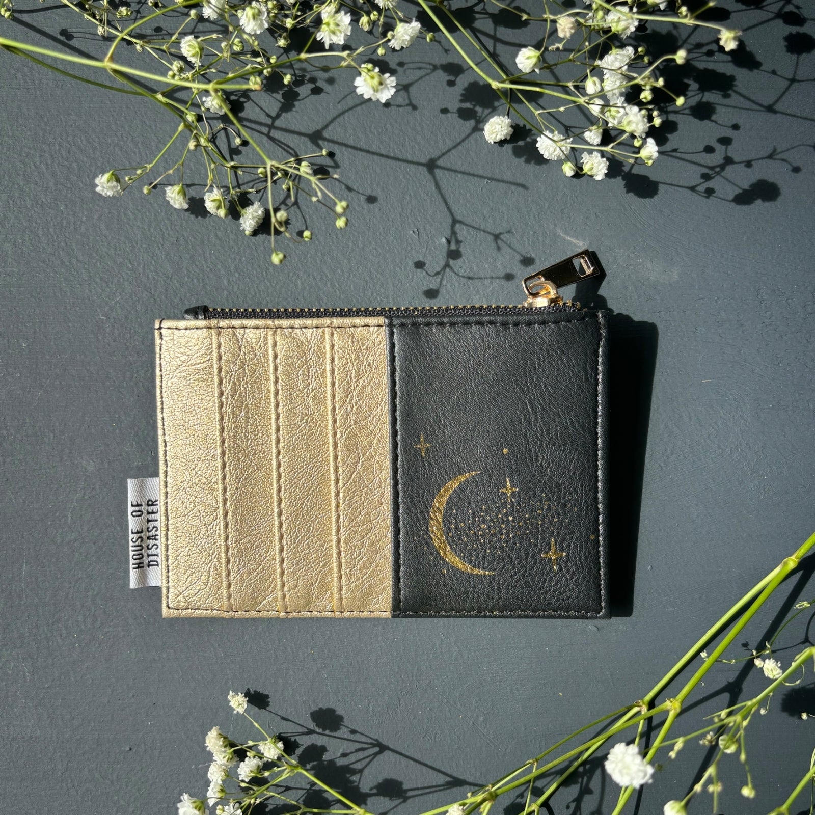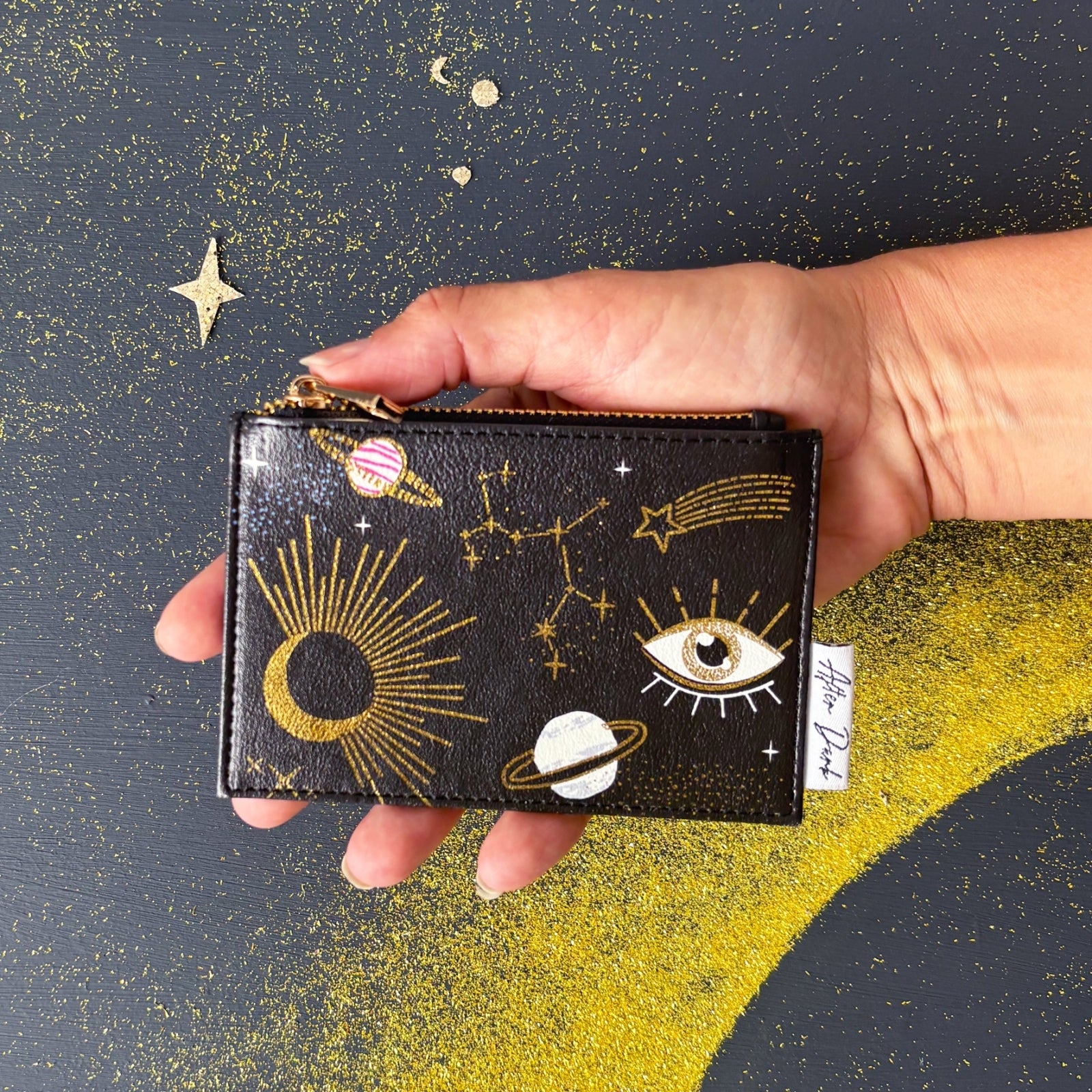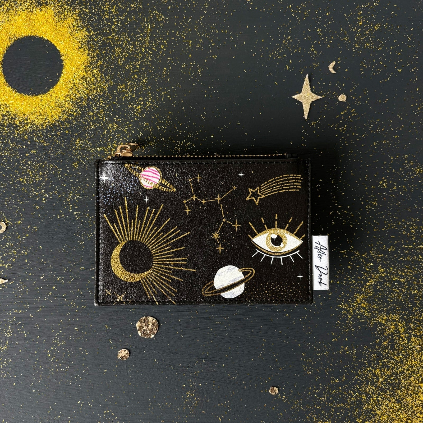 Kenmerken: Trakteer jezelf op een vleugje kosmische elegantie met deze prachtige ritstas. Dit kleine accessoire is bedrukt met geïllustreerde sterren en planeten en is net zo magisch als de schatten die erin zitten. Zwart PVC geeft het gevoel van een nachtelijke hemel, terwijl goudkleurige vakjes en accentdetails een vleugje licht toevoegen. Met vier vakjes voor pasjes en een groot vak met ritssluiting in het midden voor geld is deze tas een prachtig cadeau voor fans van sterrenkijken.