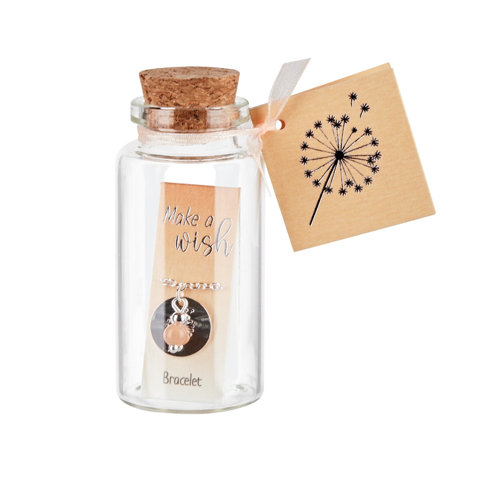 Schattig, klein glas met daarin armbandje met een betoverende hanger van echte steen en een klein plaatje. Het armbandje heeft een verlengkettinkje van ca. 3 cm en is dus variabel in lengte.