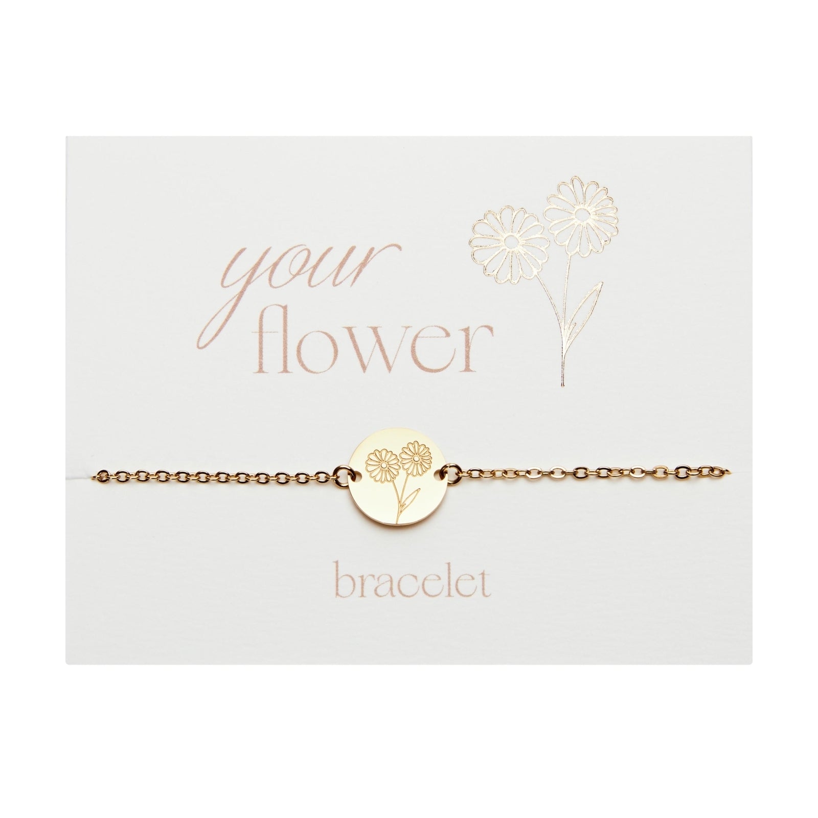 De collectie Your Flower bestaat uit kettingen en armbanden, elk gegraveerd met een geboortebloem. Alle sieraden zijn gemaakt van roestvrij staal en 6 geboortebloemen zijn ook verguld. De armbanden zijn aan beide zijden gegraveerd met de geboortebloem.