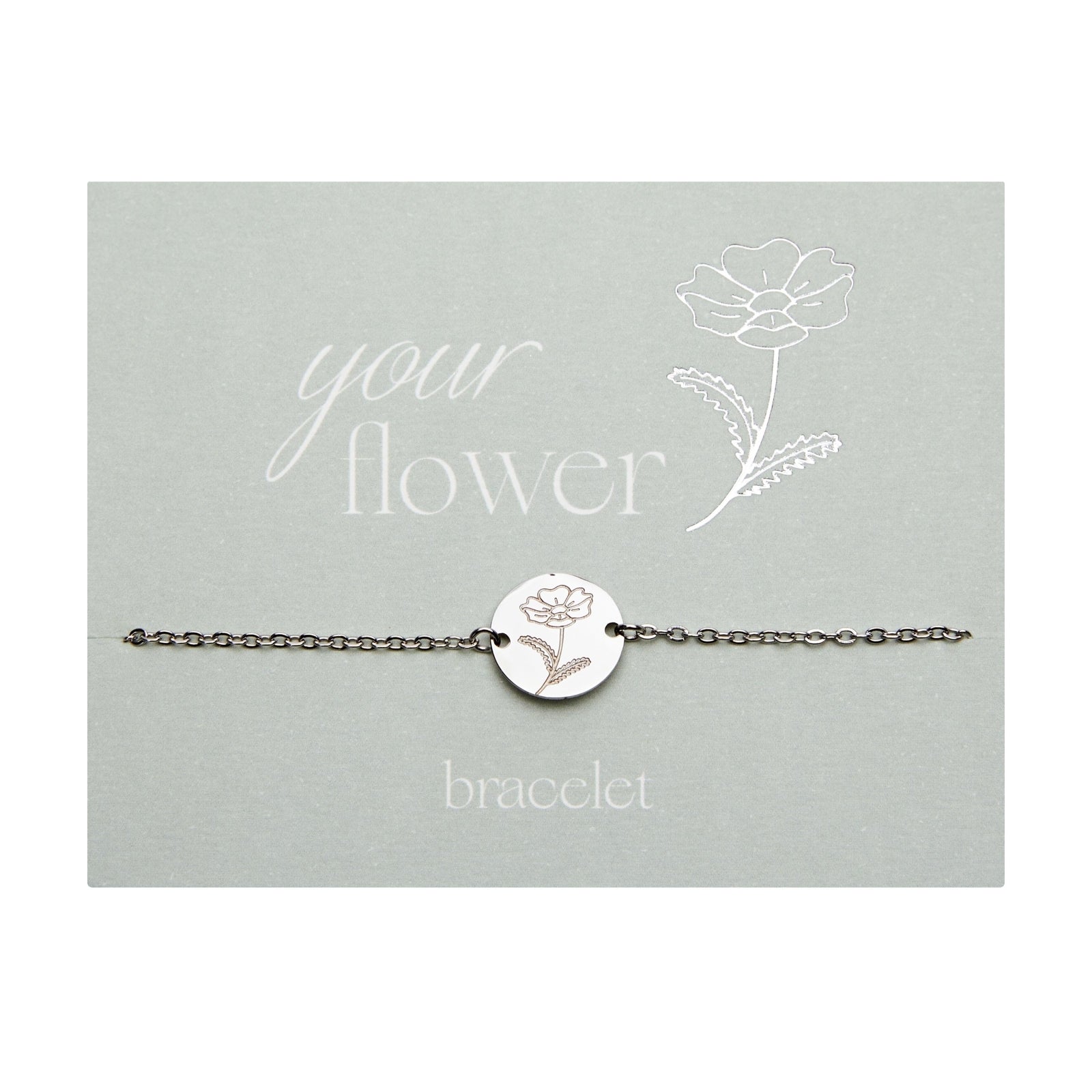 De collectie Your Flower bestaat uit kettingen en armbanden, elk gegraveerd met een geboortebloem. Alle sieraden zijn gemaakt van roestvrij staal en 6 geboortebloemen zijn ook verguld. De armbanden zijn aan beide zijden gegraveerd met de geboortebloem.