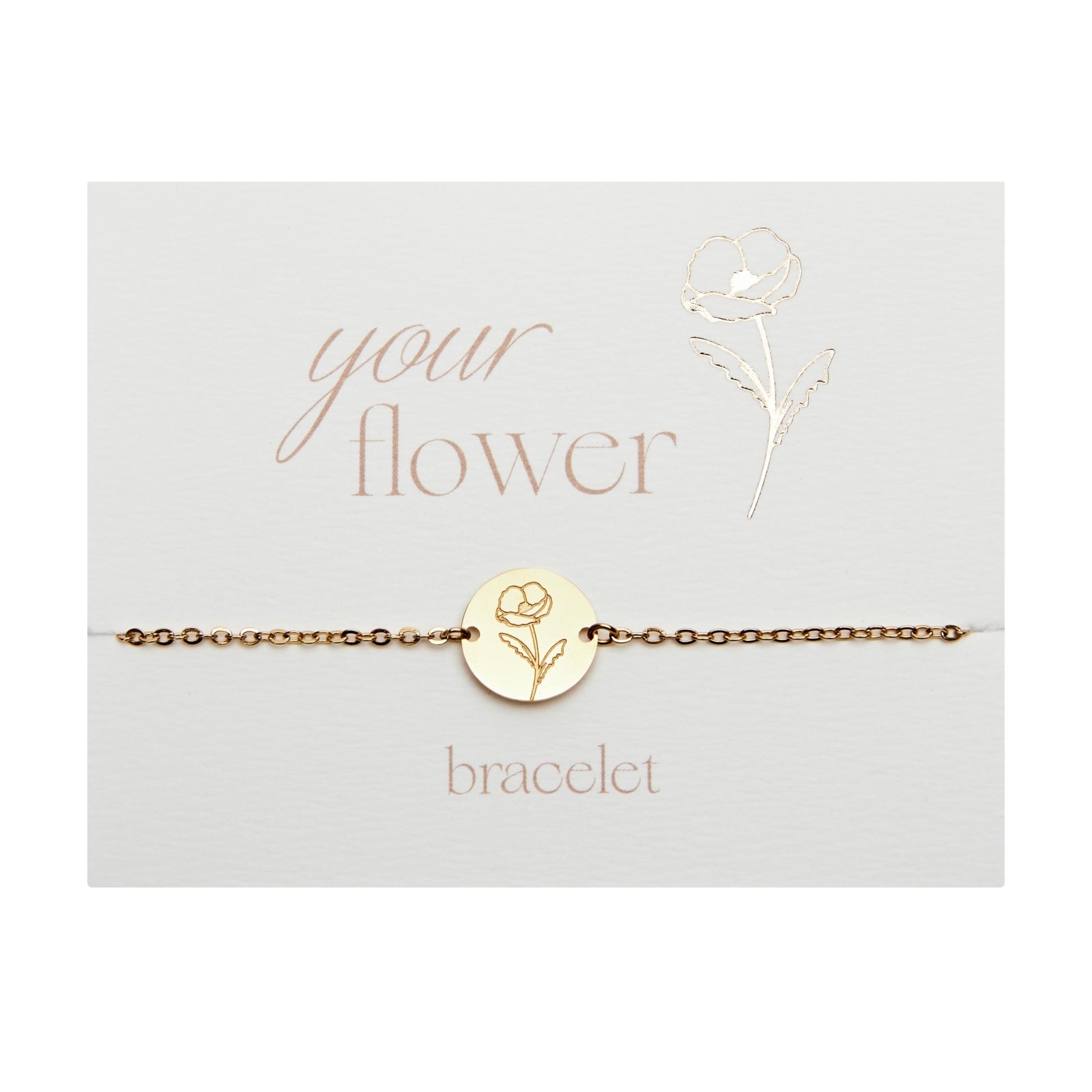De collectie Your Flower bestaat uit kettingen en armbanden, elk gegraveerd met een geboortebloem. Alle sieraden zijn gemaakt van roestvrij staal en 6 geboortebloemen zijn ook verguld. De armbanden zijn aan beide zijden gegraveerd met de geboortebloem.