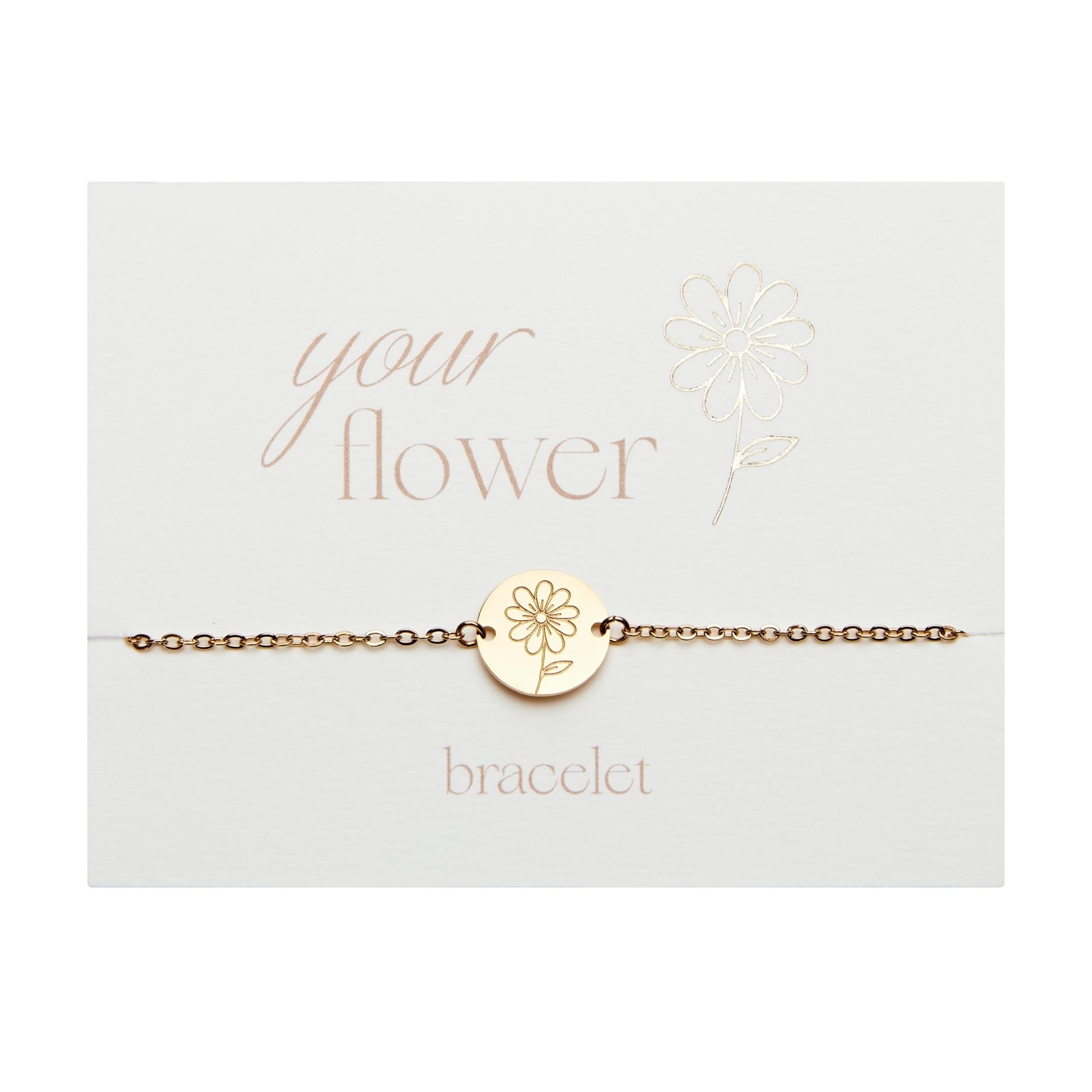 De collectie Your Flower bestaat uit kettingen en armbanden, elk gegraveerd met een geboortebloem. Alle sieraden zijn gemaakt van roestvrij staal en 6 geboortebloemen zijn ook verguld. De armbanden zijn aan beide zijden gegraveerd met de geboortebloem.