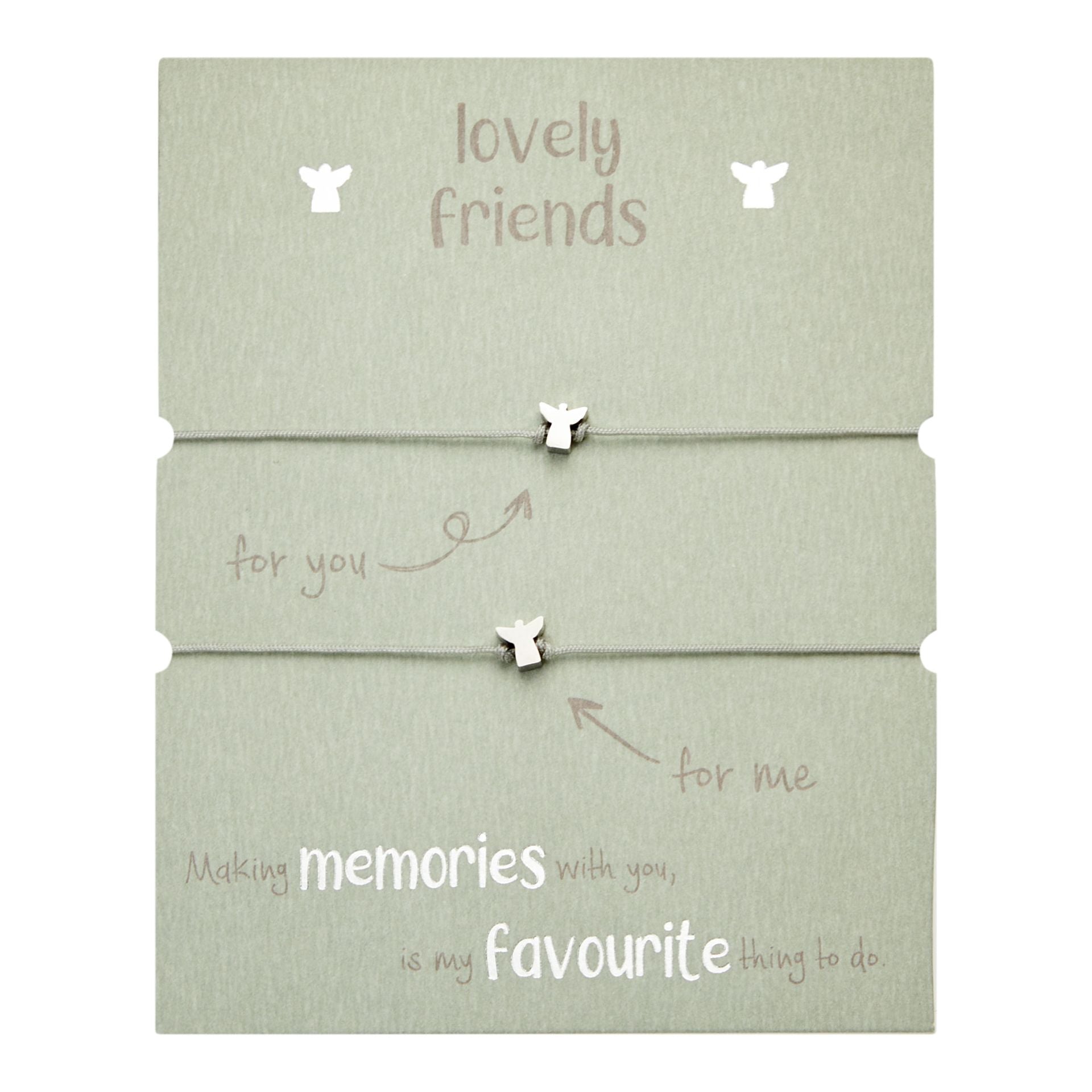 Mooie set van twee eenvoudige armbanden van textiel met het engelsymbool, om te delen of om zelf te houden. De armband kan in maat worden versteld door aan de uiteinden te trekken.