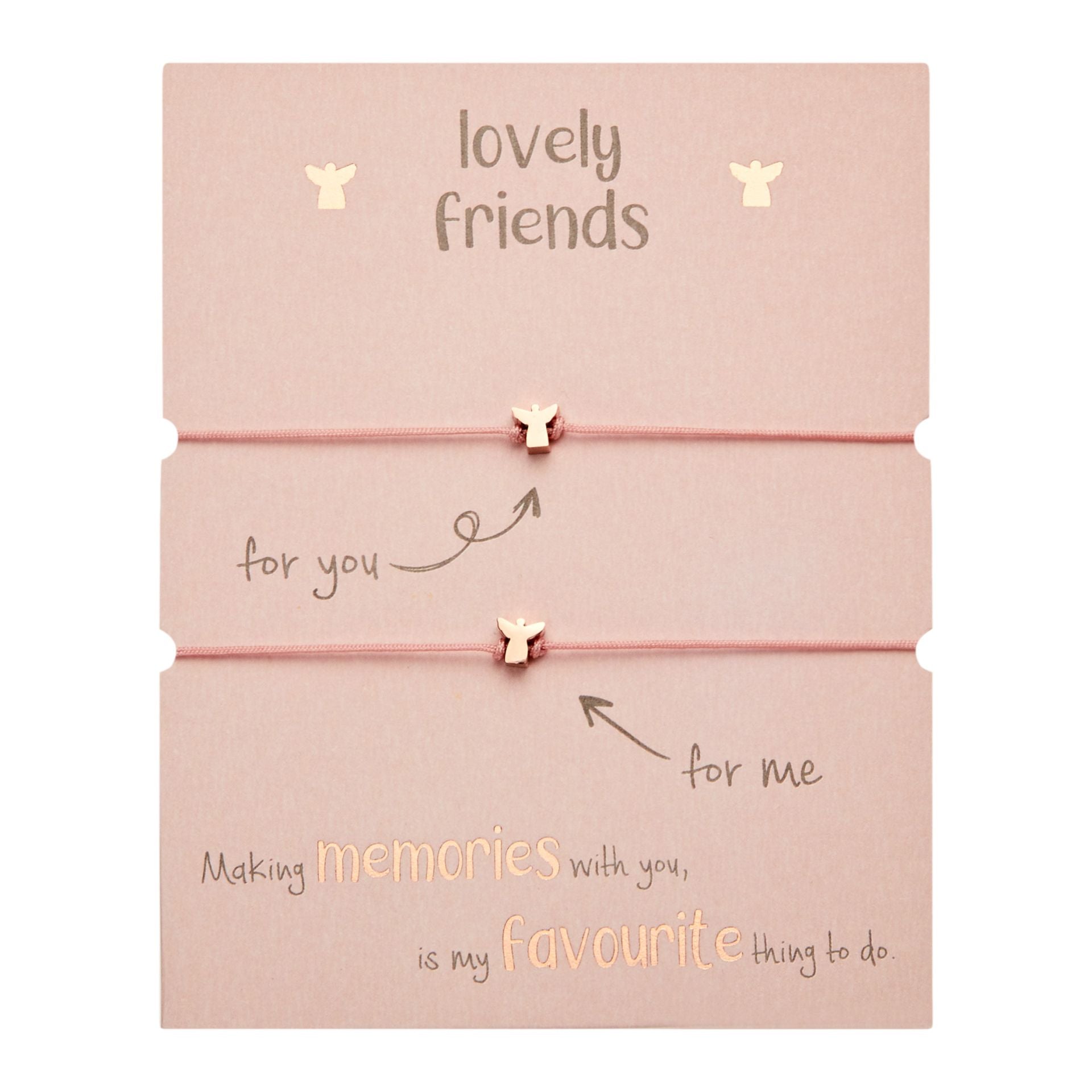 Mooie set van twee eenvoudige armbanden van textiel met het engelsymbool, om te delen of om zelf te houden. De armband kan in maat worden versteld door aan de uiteinden te trekken.