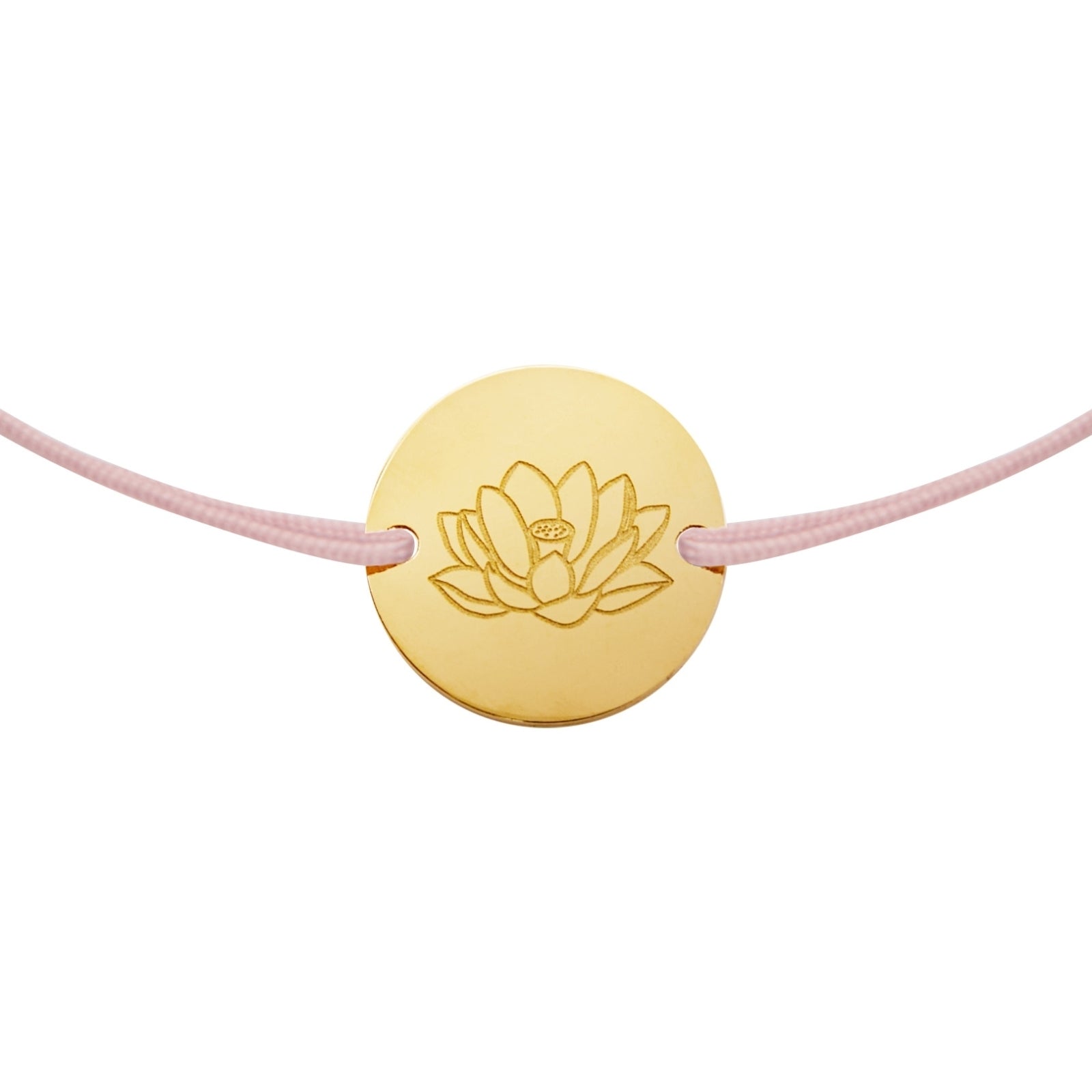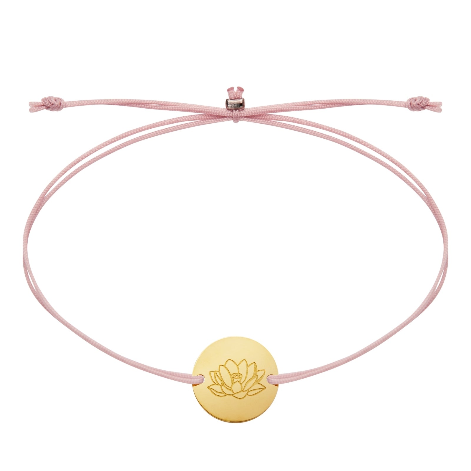 Smaakvolle, eenvoudige textielarmband met lotusbloem-symbool. De armband kan in maat worden versteld door aan de uiteinden te trekken.
