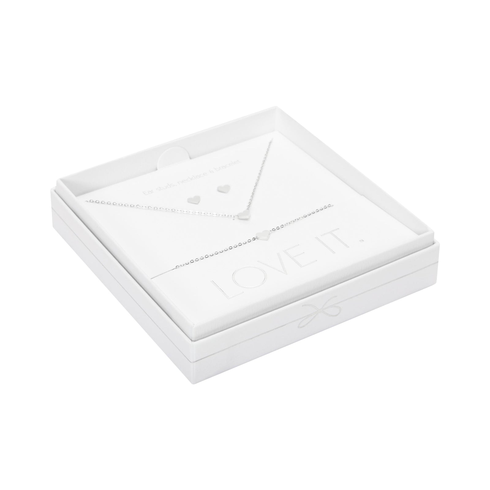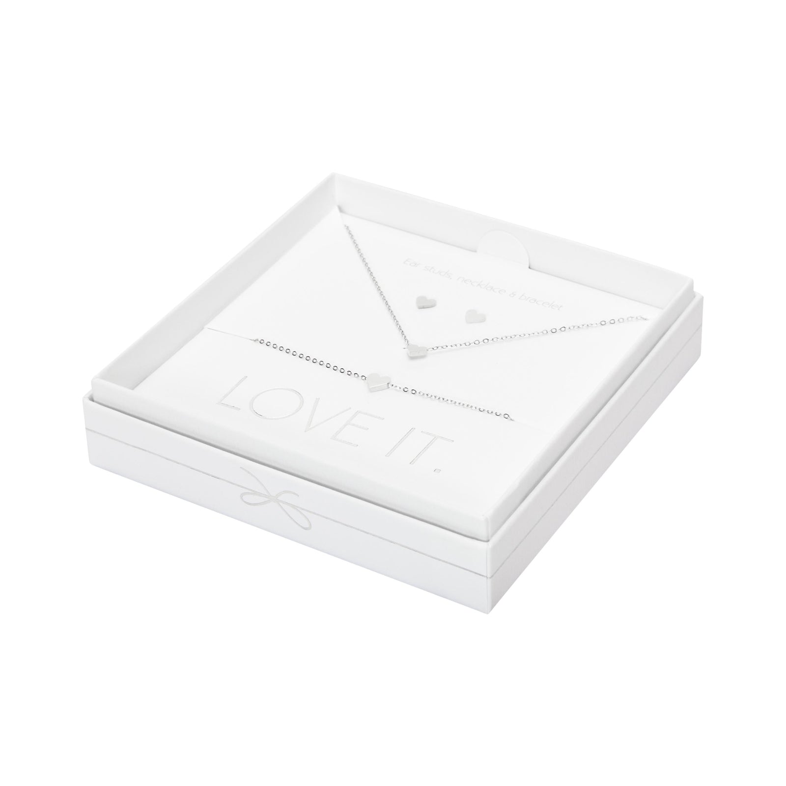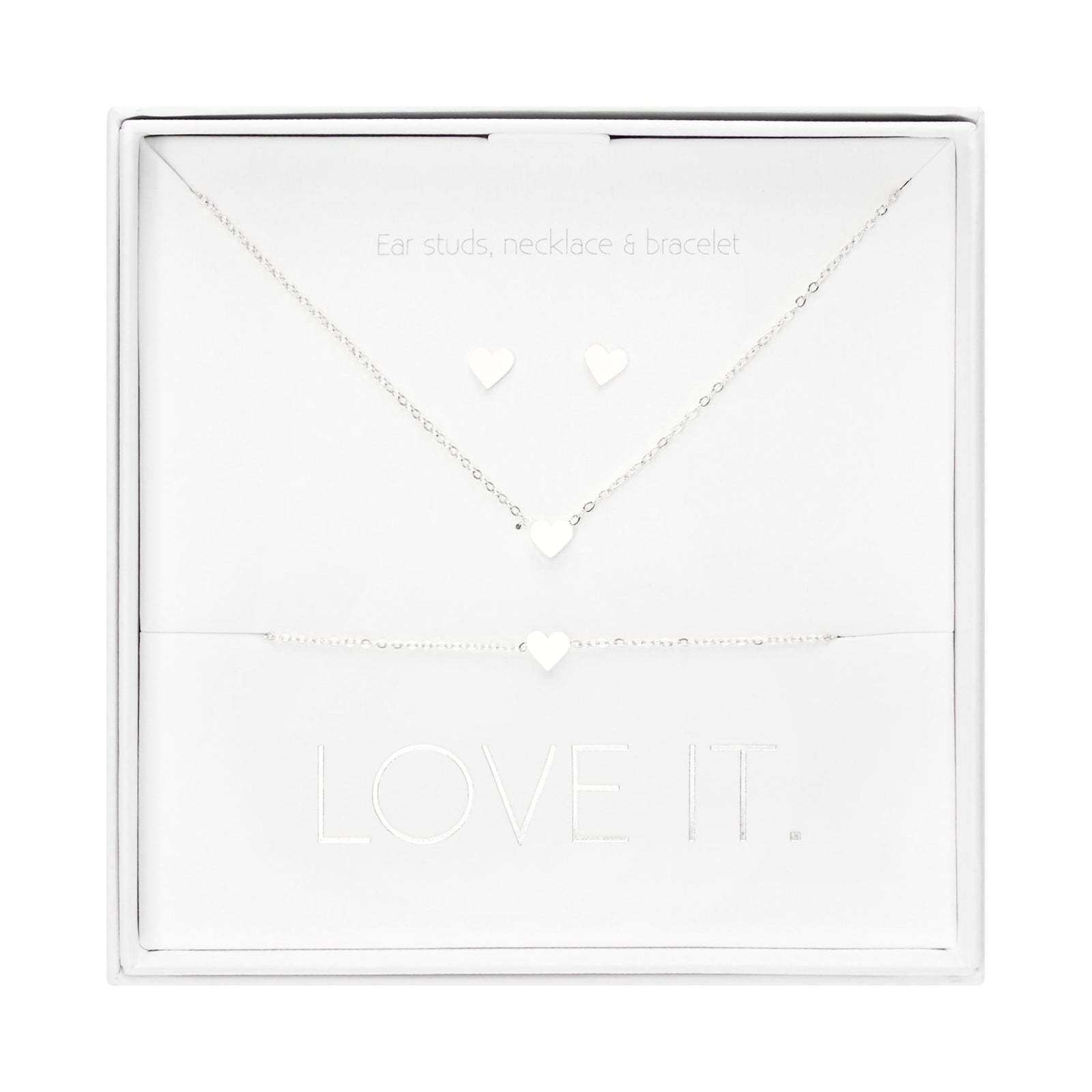 Een hoogwaardige geschenkset uit de Love it. collectie bestaande uit een armband, ketting en oorstekers. Prachtig verpakt in een elegante kartonnen geschenkdoos met venster en glanzende hot foil-stempel.
