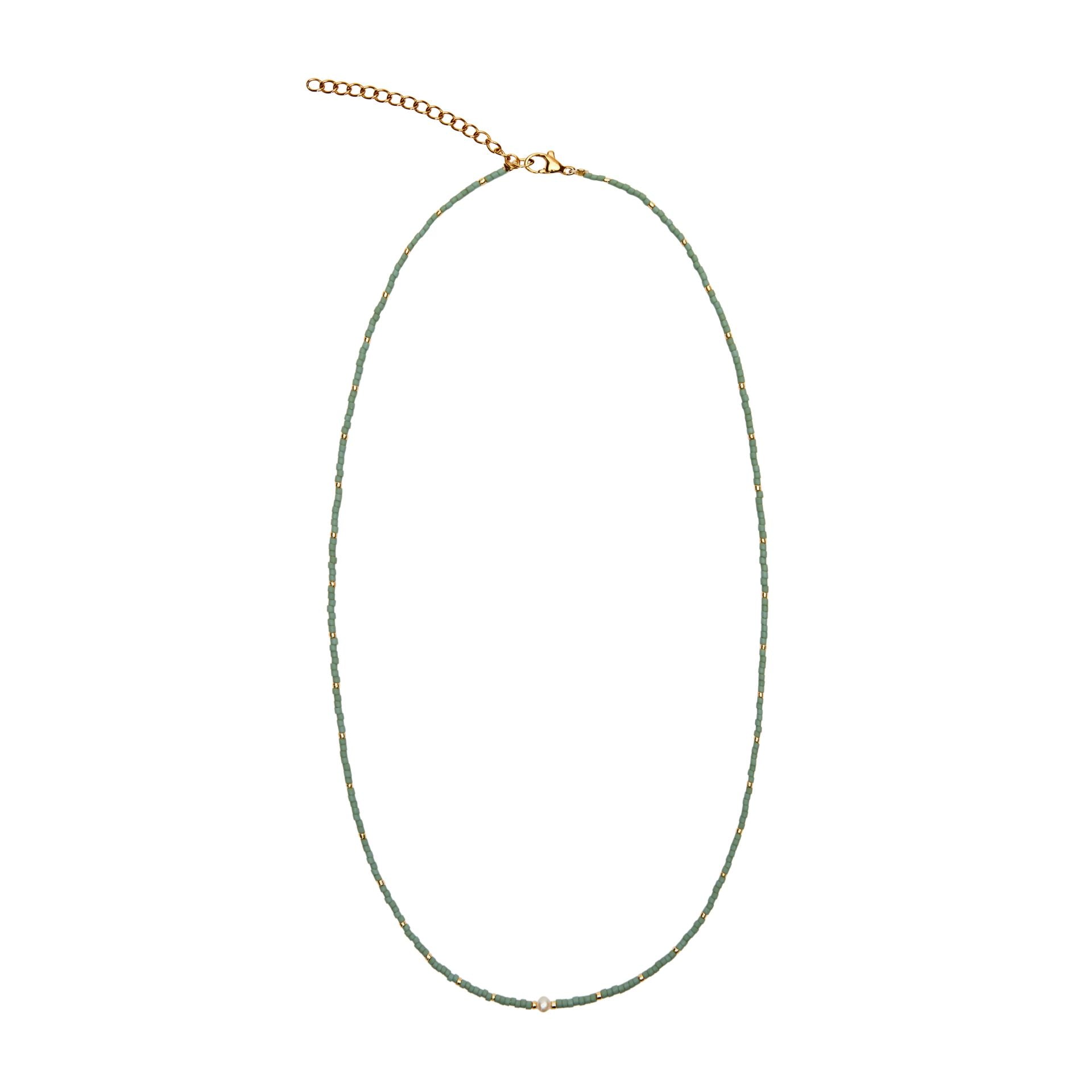 Prachtige ketting gemaakt van een combinatie van Miyuki en gekweekte zoetwaterparels in de kleur mint. De ketting heeft een verlengkettinkje van ca. 5 cm en is daardoor variabel in lengte.