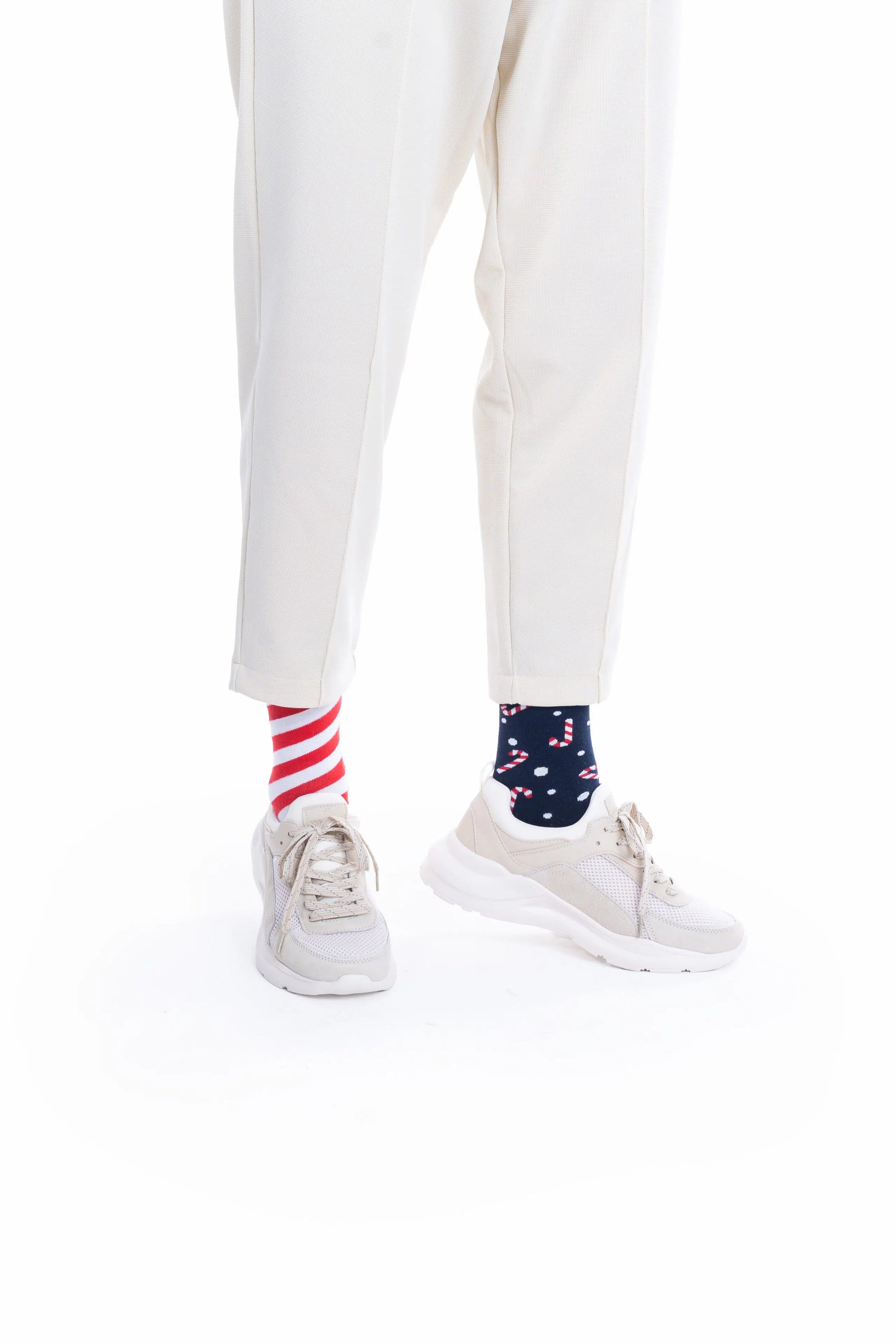 Kerstmis draait niet alleen om snoep... maar laten we niet ontkennen dat het een vreselijk goed onderdeel van de viering is - diëten en goede voornemens voor het nieuwe jaar kunnen wel een paar dagen wachten! Kerstsokken met een kleurrijk zuurstokontwerp. Sokken in donkerblauw, wit en rood.