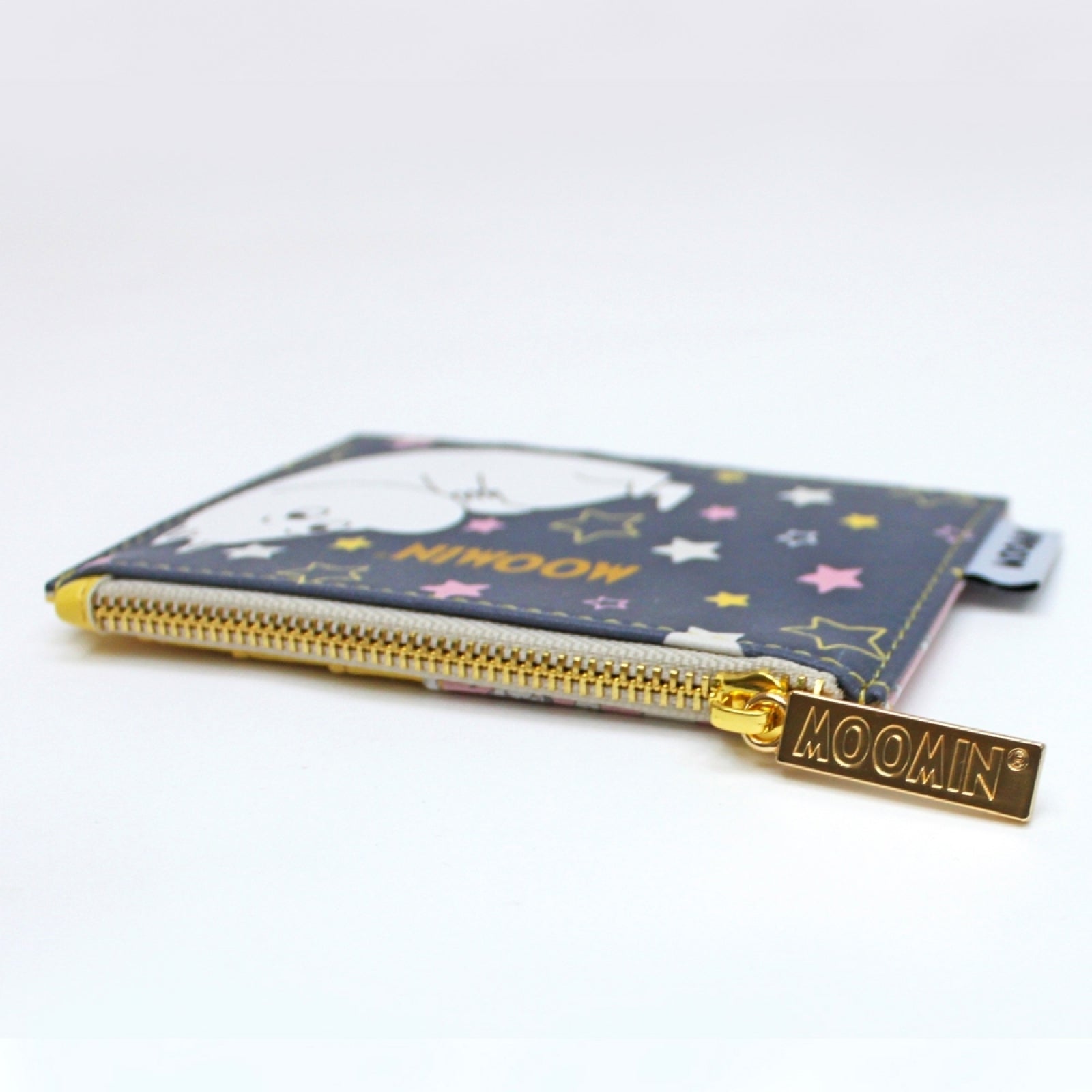 Kenmerken: Een heel schattig portemonneetje met een metalen gegoten Moomin-logo ritstrekker. Vier kaartsleuven met een bedrukte roze en gele Moomin-herhaling keerzijde. Compacte vorm waardoor het super gemakkelijk is om contant geld en kaarten mee te nemen. Binnenkant: katoenen voering.