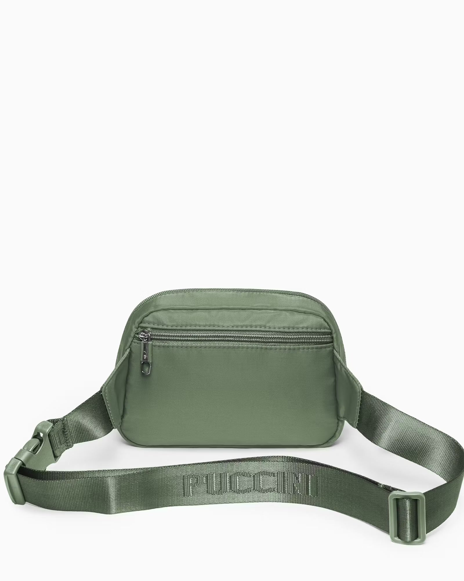 De heuptas heeft een verstelbare stoffen riem met het opgedrukte PUCCINI-logo. Je kunt hem op twee manieren dragen: op de heupen of crossbody.