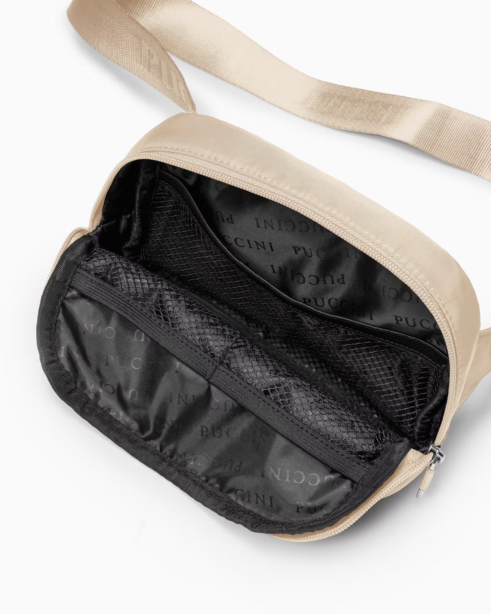 De heuptas heeft een verstelbare stoffen riem met het opgedrukte PUCCINI-logo. Je kunt hem op twee manieren dragen: op de heupen of crossbody.