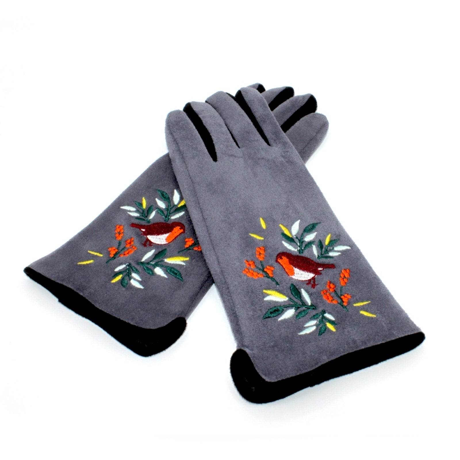 Deze opvallende grijze handschoenen hebben een schattig geborduurd roodborstje en gebladertepatroon. Ze zijn superzacht en het geborduurde detail op de wijsvinger maakt ze touch-screen vriendelijk. De perfecte statement handschoenen om je handen lekker warm te houden deze winter!