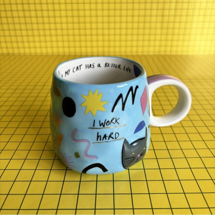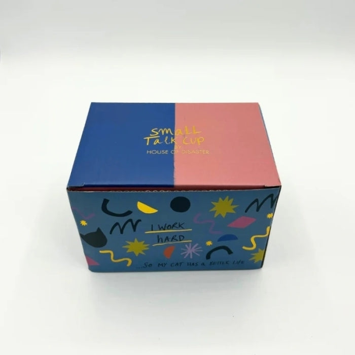 Materialen: Keramiek Kenmerken: Sta op en schitter cafeïneliefhebbers! Maak kennis met de nieuwe mok in de stad, de “Cat” mok van Small Talk. Deze eigenzinnige kleine mok is vervaardigd met een handgemaakt, gehavend gevoel - de wankelheid maakt allemaal deel uit van de charme! Deze mok heeft een speelse all-over printprint, een 3D-kattengezicht en een geheime boodschap aan de binnenkant. Dit kleine briefje luidt: "Ik werk hard... zodat mijn kat een beter leven heeft"... wie kan zich er nog meer mee identificeren?