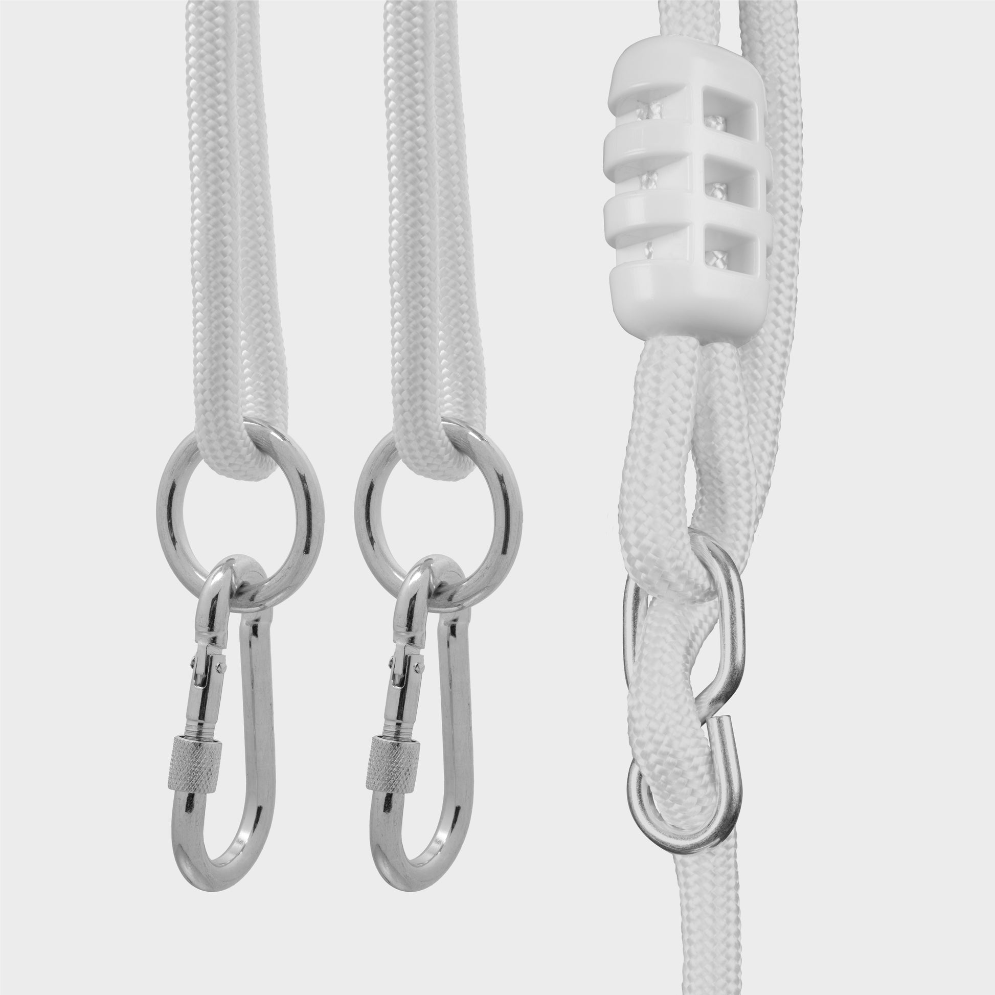 Met de 2 karabijnhaken in de set kun je de schommel aan de voorbereide montagestructuur (balken/haken) vasthaken.