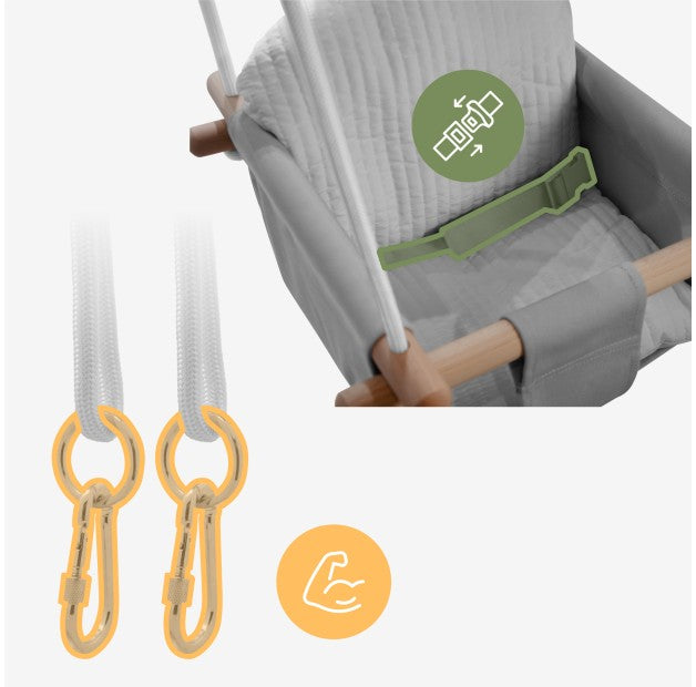 Om de tere huid van uw kind te beschermen, hebben we voor de Hop 33-schommels natuurlijke materialen gebruikt. Het zacht aanvoelende katoenen doek zorgt voor een goede luchtdoorlatendheid. De constructie van beukenhout garandeert een esthetisch design.