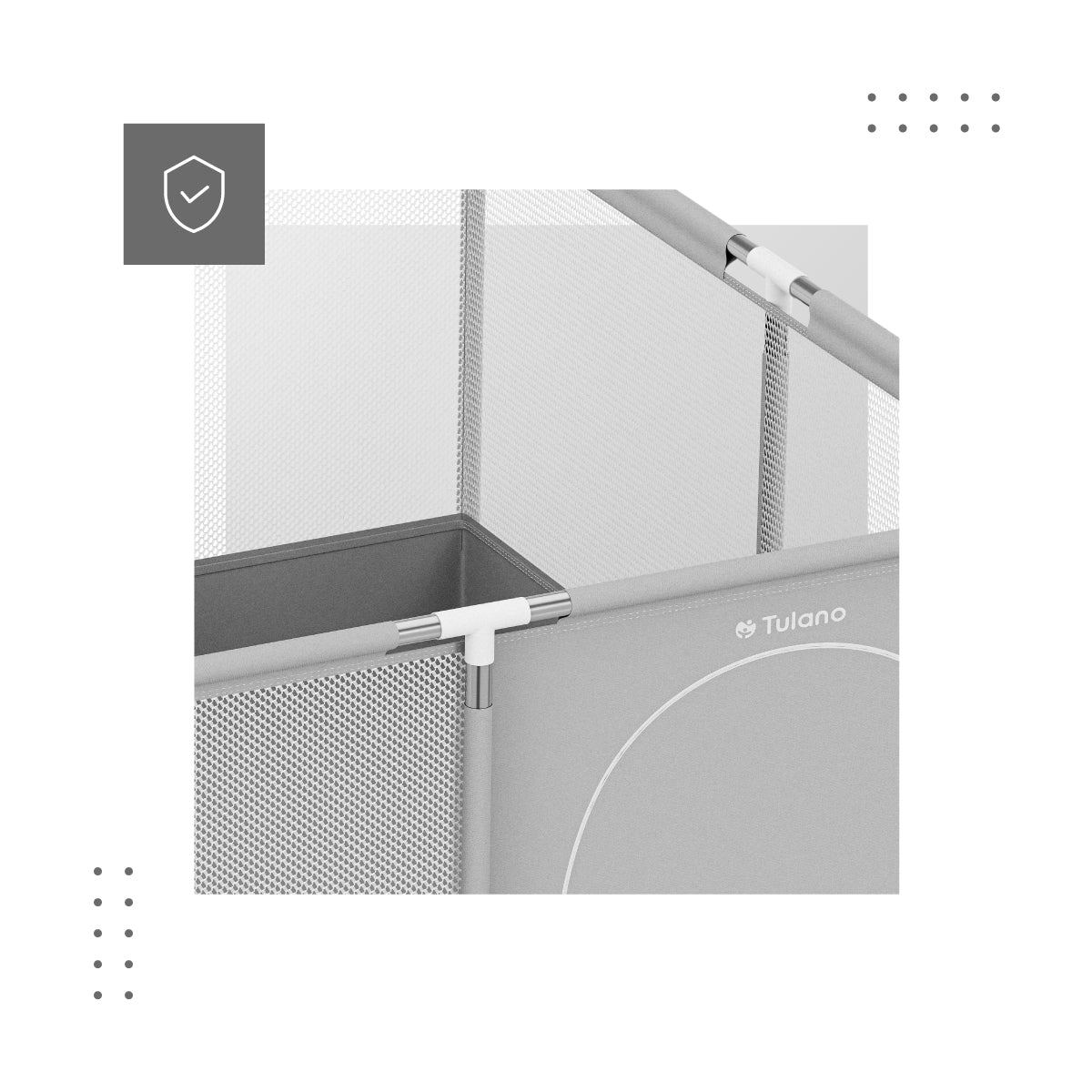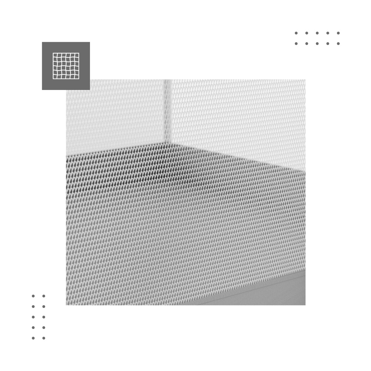 De zijkanten van de box zijn gevuld met luchtdoorlatend gaas, waardoor je toezicht kunt houden op je kind en je kleintje de omgeving kan observeren. Het hoogwaardige materiaal garandeert een constante luchtcirculatie.