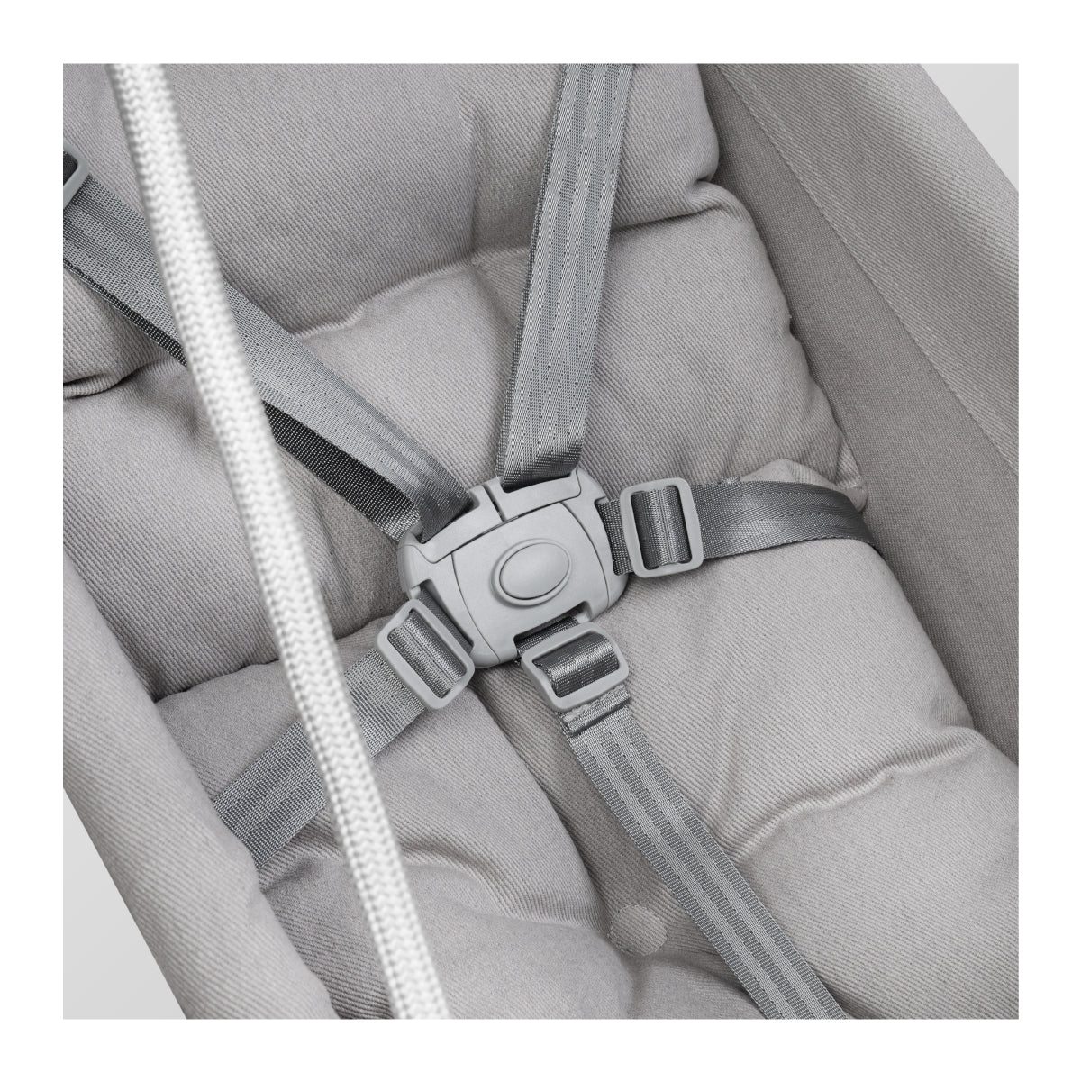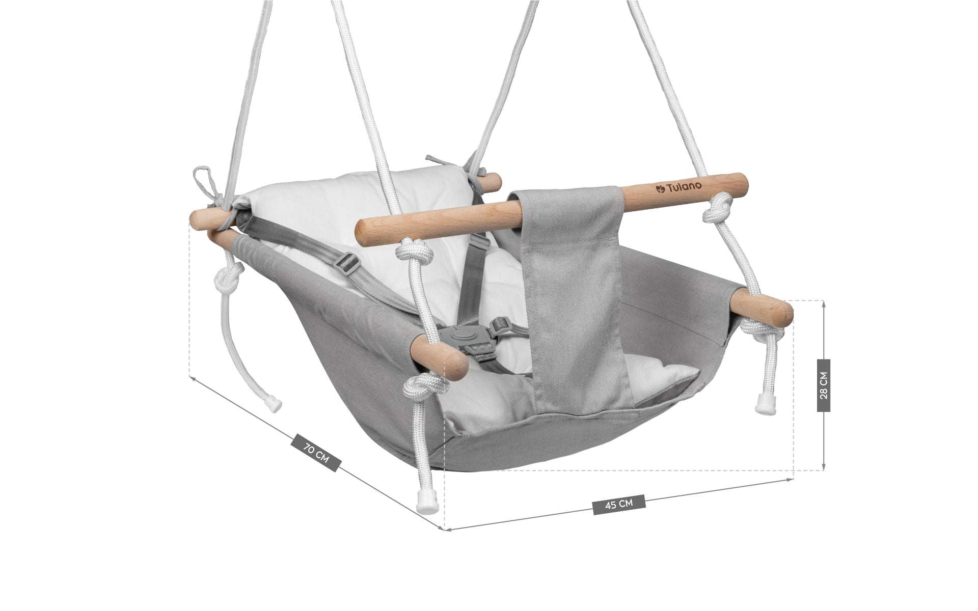 Het zachte, wit met grijze kussen, dat aan beide zijden gebruikt kan worden, zorgt voor het comfort van de kleine. Dankzij dit kussen kun je het ontwerp van de schommel snel veranderen en aanpassen aan elke opstelling.