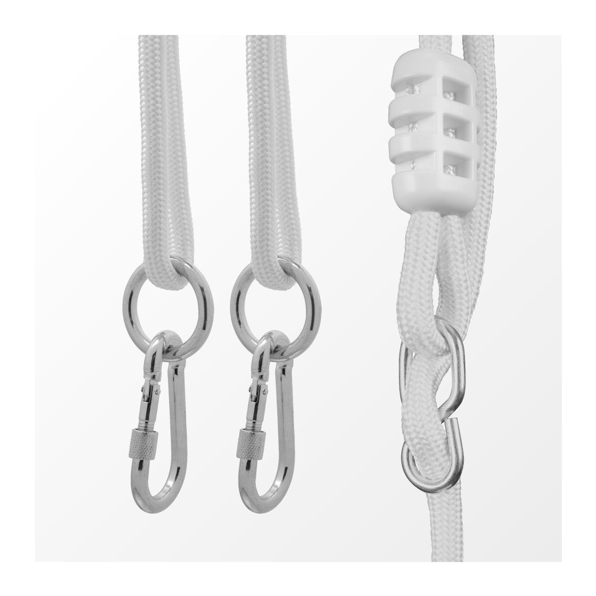 De Hop 40 schommel wordt voorgemonteerd geleverd - pas gewoon de lengte van de touwen aan je ruimte aan. Bovendien bevat de set 2 karabijnhaken waarmee je de schommel eenvoudig aan een voorbereide montagestructuur kunt vasthaken, of het nu een balk of een haak is. Dit bespaart je tijd en voorkomt ingewikkelde montage-instructies!